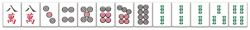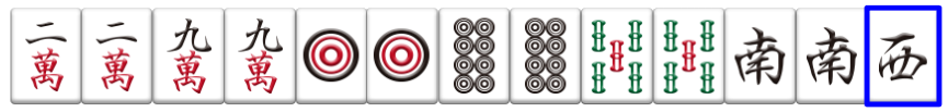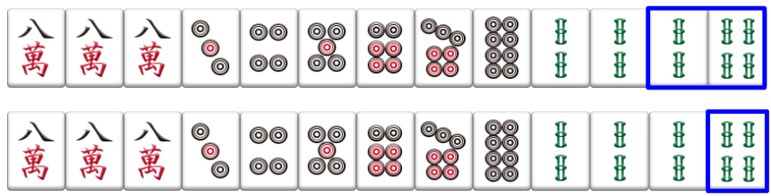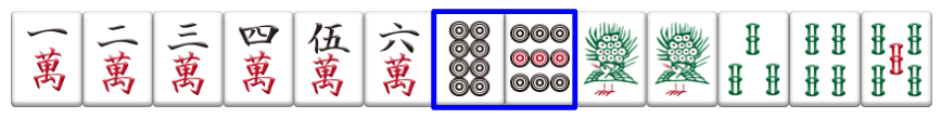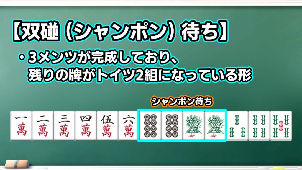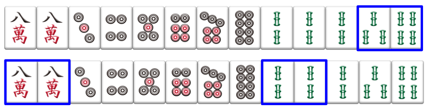 そして本題のシャンポン待ちですが、これは3メンツが完成しており、残りの牌がトイツ2組になっている形です。
