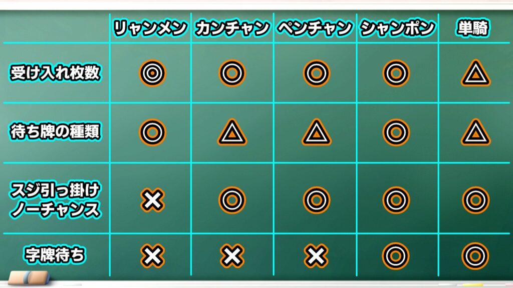 待ち牌の種類については、2種類あるリャンメンとシャンポンが比較的優秀です。
