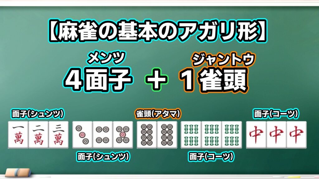 まず大前提として、麻雀の基本のアガリ形は4メンツ+1雀頭の14枚です。