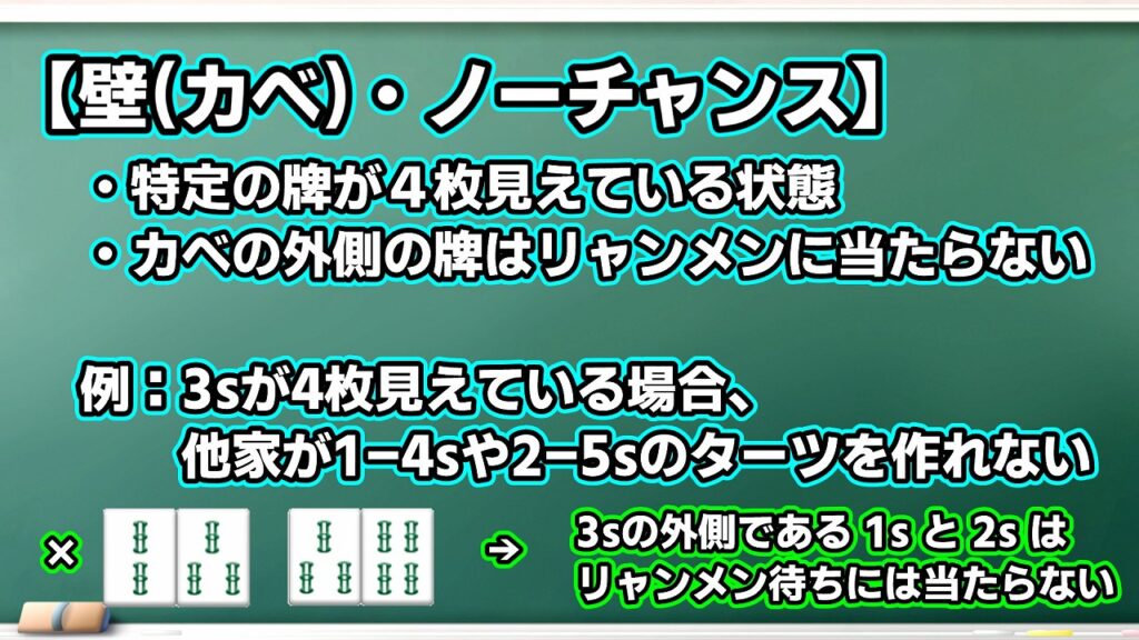 次はカベですが、別名でノーチャンスとも呼ばれます。これは特定の牌が4枚すべて見えている状態を指しています。