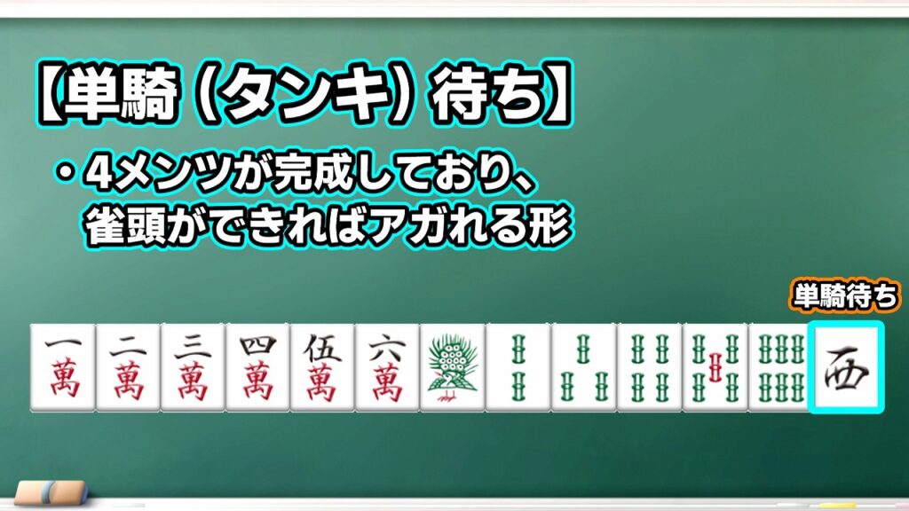 - 単騎:スジや壁ができる/字牌やスジ1・9待ちが可能【○】