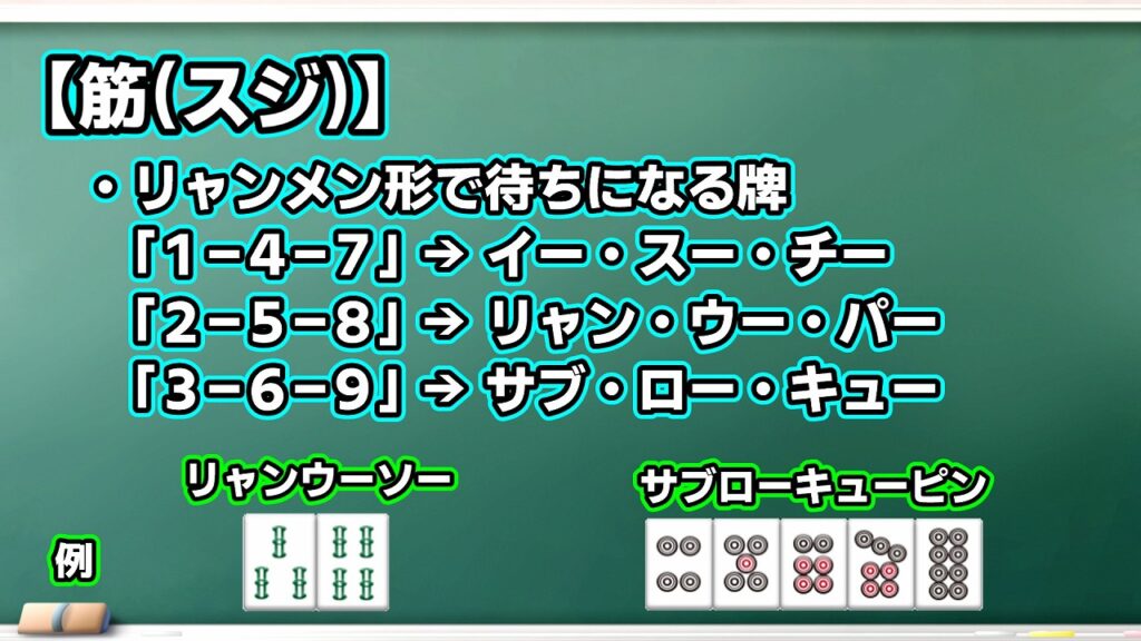 まずはスジですが、これはリャンメン形で待ちになる牌を示す概念です。
