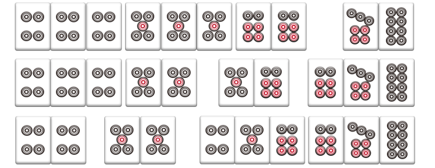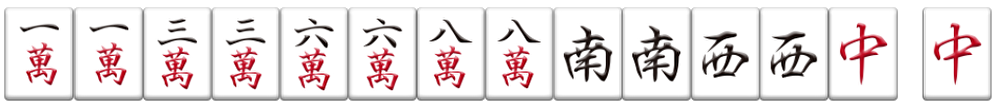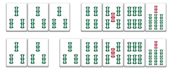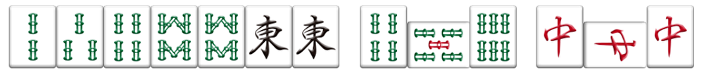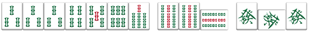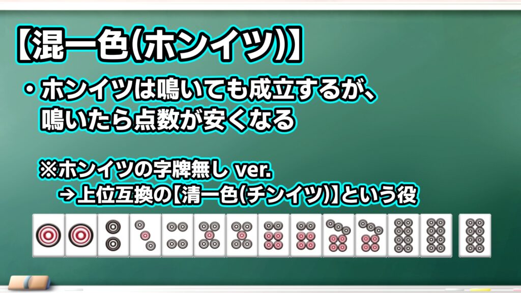 ちなみに字牌を使用せずマンズ・ピンズ・ソーズのいずれか1種類だけでアガリ形を作ると、チンイツという上位互換の役になります。チンイツはメンゼンだと六翻、鳴いた場合は五翻に喰い下がります。