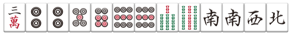 図11の配牌でピンズのホンイツを狙う場合、打点を無視すればかなりアガれそうに見えます。しかし南西北がすべてオタ風だったり、ドラがマンズやソーズの数牌だったりすると、ホンイツのみの安いアガリになってしまう可能性が高いです。