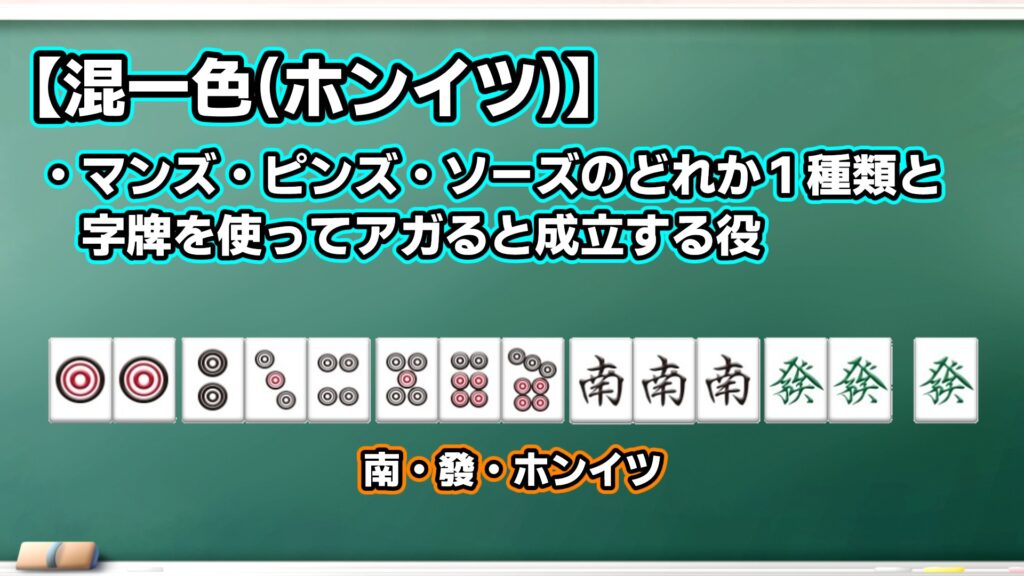 - ホンイツはいずれか1色と字牌だけでアガリ形を作る役