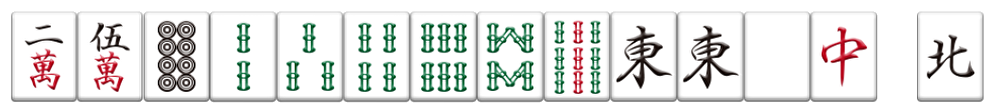 もし図8のような配牌を貰ってソーズのホンイツを狙う場合、マンズやピンズの孤立牌から切っていくのが自然な切り順になります。そうすると8p2m5mと切っていき、マンズとピンズが無くなったら孤立の字牌を切り、最後にソーズの数牌が切り出される、といった順序になるのが普通です。