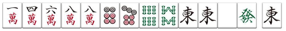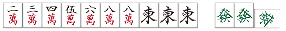 以上がホンイツを狙った際のセオリーで、自分の河は図9のようになります。そしてテンパイしたときは例えば図10のような手牌となっているでしょう。