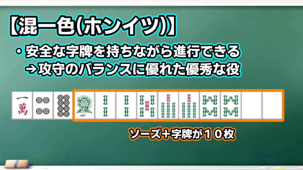 先に述べた放銃しないような進行については基本的に字牌が手にあれば守備力が高くなりますが、ホンイツはその安全な字牌を持ちながら進行できます。そういった意味でもホンイツは攻守のバランスに優れた役と言えます。