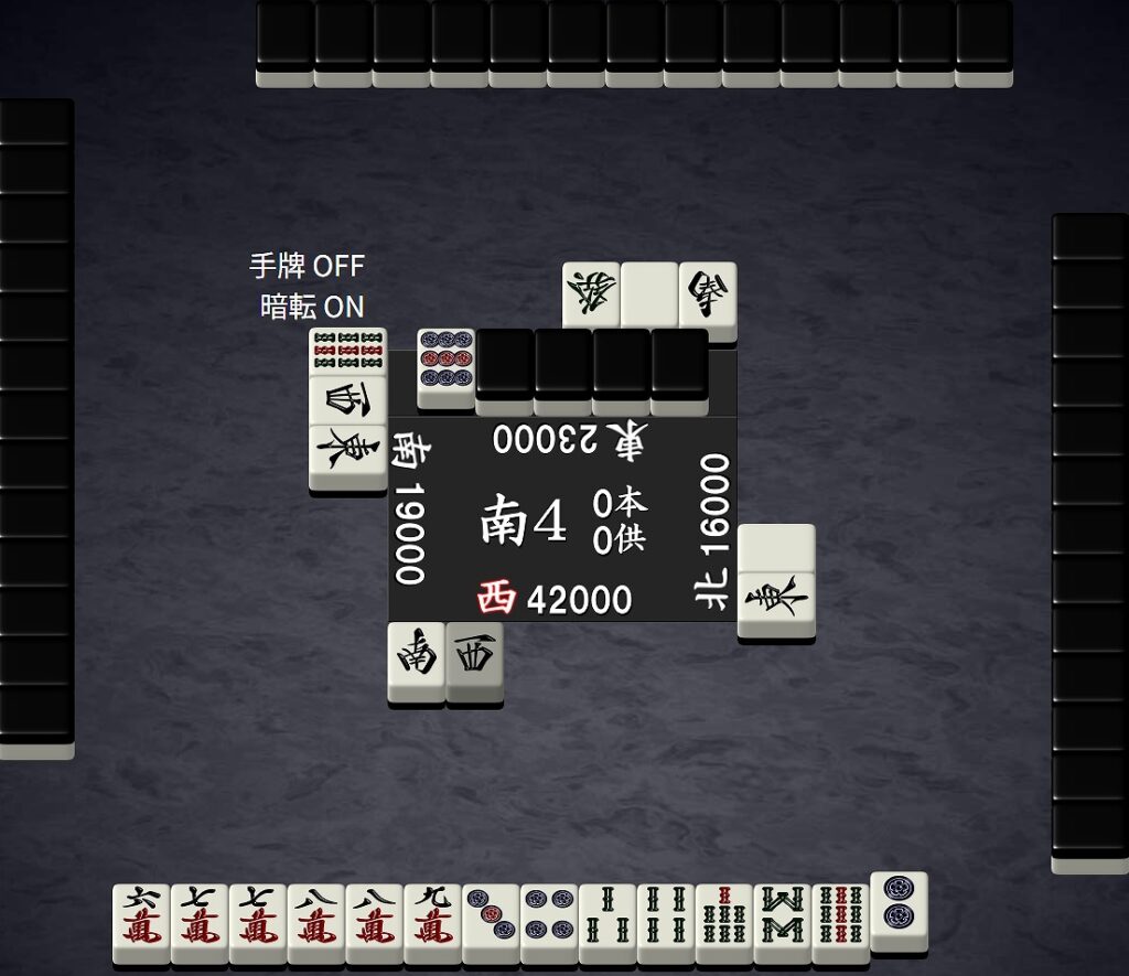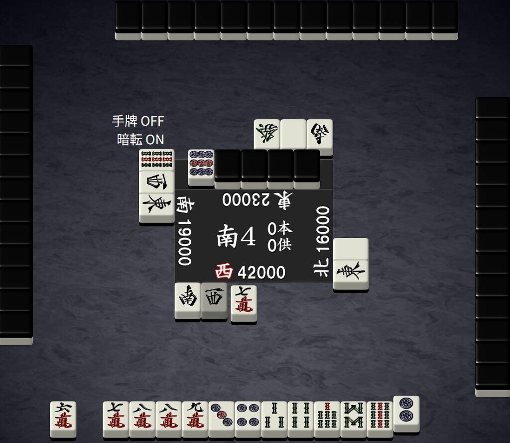ここは3s単騎テンパイを取るのが普通ではありますが、あえて打7mでテンパイ外しをした場面が図11です。
