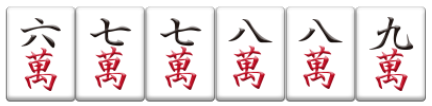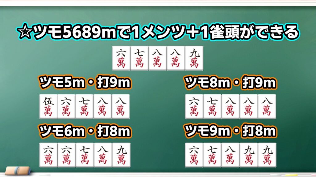 これらを簡単にまとめると、一手で2メンツを作るにはツモ7mの1種3枚しかないため厳しいですが、一手で1メンツ+1雀頭を作るにはツモ5-8m・6-9mの4種12枚あるため、雀頭作りにはとても有用な形です。